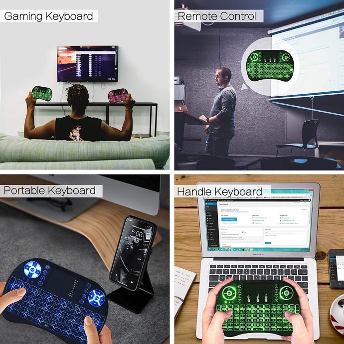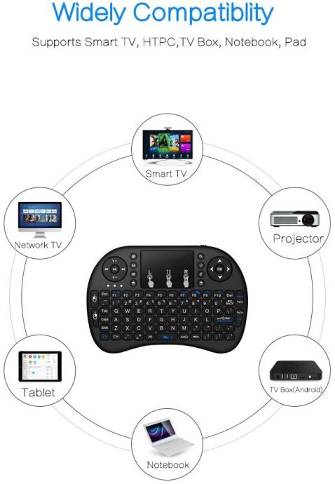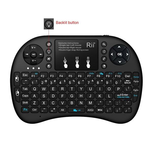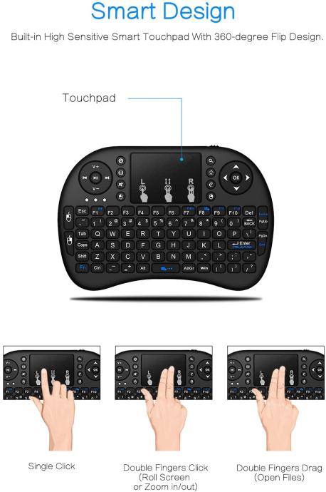Bežična QWERTY tipkovnica + dodirna podloga koja podržava funkcije više prstiju (klik jednim prstom kao lijeva funkcija miša dva klika kao desna funkcija miša dvostruko povlačenje prsta kao zaslon s rolanjem). Sadrži 92 tipke.