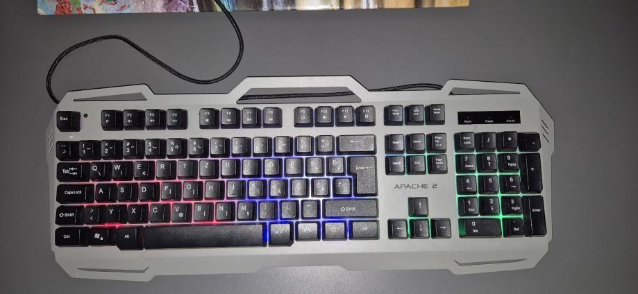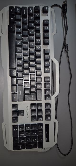 Prodajem White Shark Apache 2 gaming tipkovnicu. Radi se o žičnoj tipkovnici s RGB podsvjetljenjem i karakterističnim dizajnom u sivoj i crnoj boji. Spojena je putem USB kabela.