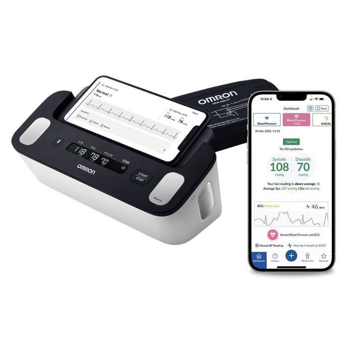OMRON OMRON Complete 2-u-1 omogućuje brzo otkrivanje nepravilnog srčanog ritma, kao što su atrijska fibrilacija, tahikardija i bradikardija. Ovaj tlakomjer trenutačno prikazuje rezultate mjerenja krvnog tlaka i EKG-a te interpretira rezultate EKG-a kako bi korisnici mogli s lakoćom otkriti nepravilne otkucaje srca i provjeriti je li prisutna atrijska fibrilacija.