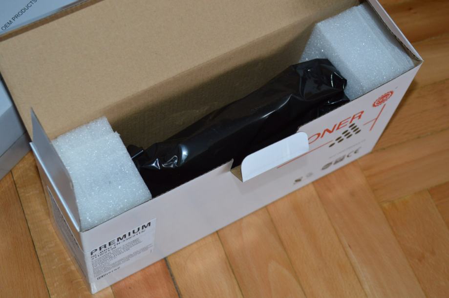 Toner je rabljen i nije dobar ( ostavlja mrlje po papiru, loš "nož" koji skida boju sa valjka ).