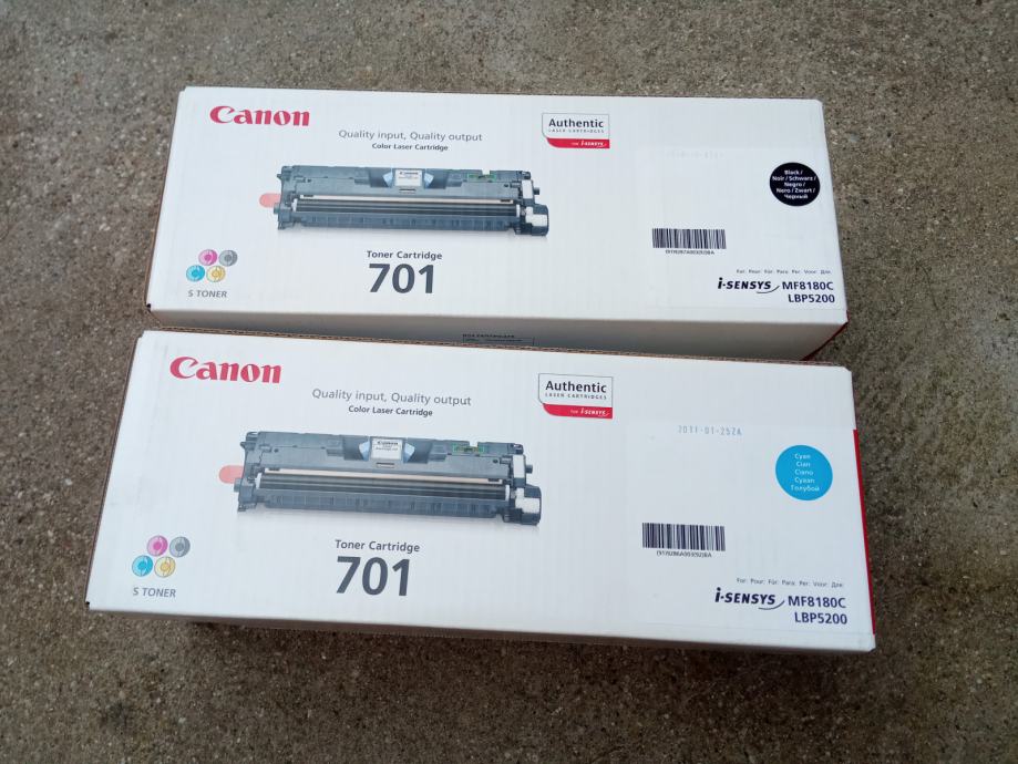 Prodajem po 1 komad novih, originalno zapakiranih tonera CANON 701 Black i Cyan (crni i plavi) koji odgovaraju za laserske printere CANON LBP5200 i MF8180C. Cijena za crni je 40 eur, a za plavi je 60 eur (što je za više od duplo jeftinije nego u dućanu).