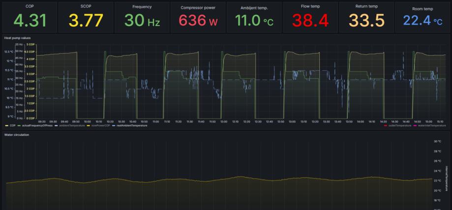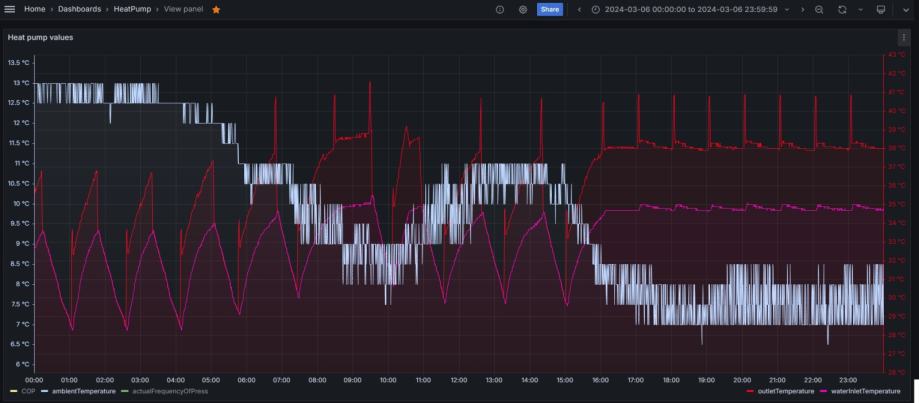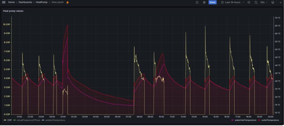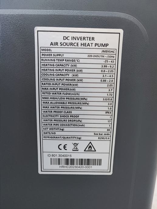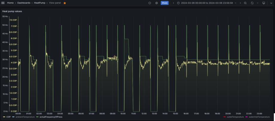 Toplinska pumpa je od 9,5 kW a do sada je radila najviše sa 4 kW grijanja. Ja sam iz Rijeke i nije mi potrebna tolika snaga jer pumpa ulazi u cikluse. Kada temperatura padne na 7C radi kontinuirano na 30 Hz. Maksimalna frekvencija kompresora je 90Hz.
