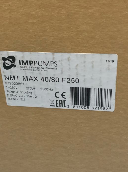 Prodajem novu cirkulacijsku pumpu IMP NMT Max 40/80 F250. Pumpa je nekorištena u originalnom pakiranju koje je otvoreno samo radi fotografiranja. Detalji su u daljnjem opisu.