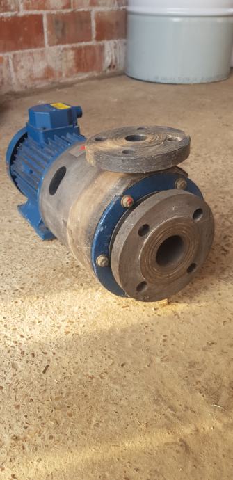 Prodajem pumpu za pretakanje tekućina na 220V pogon. Radi se o centrifugalnoj pumpi s elektromotornim pogonom plave boje, s prirubničkim priključcima (flange) na usisu i tlačnoj strani, što omogućuje jednostavnu ugradnju u cjevovod. Elektromotor ima standardnu trofaznu priključnu kutiju.