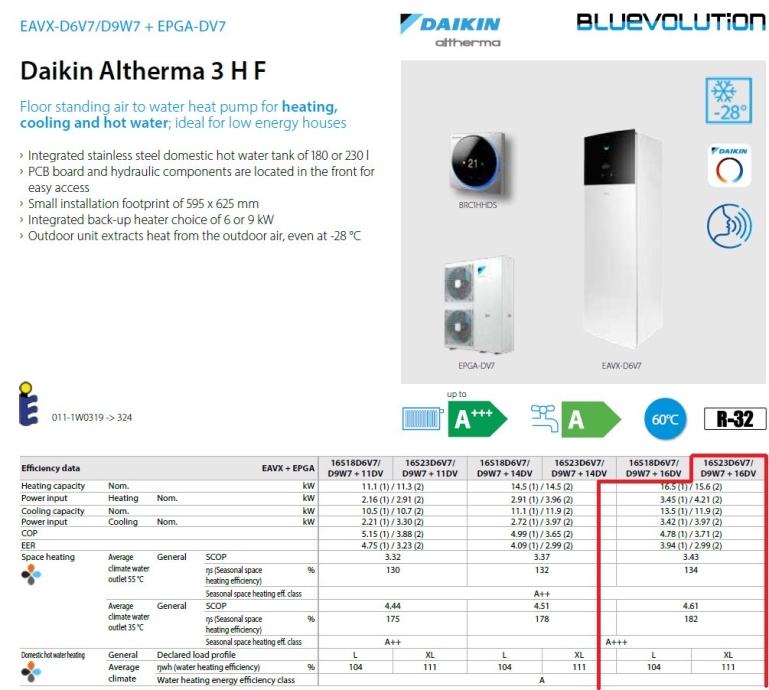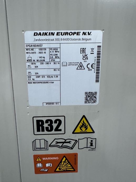 Prodajem toplinsku pumpu Daikin Altherma 3 H F, nazivne snage 16kW, sa integriranim spremnikom sanitarne vide 230l litara. Uređaj podržava režim grijanja i hlađenja.