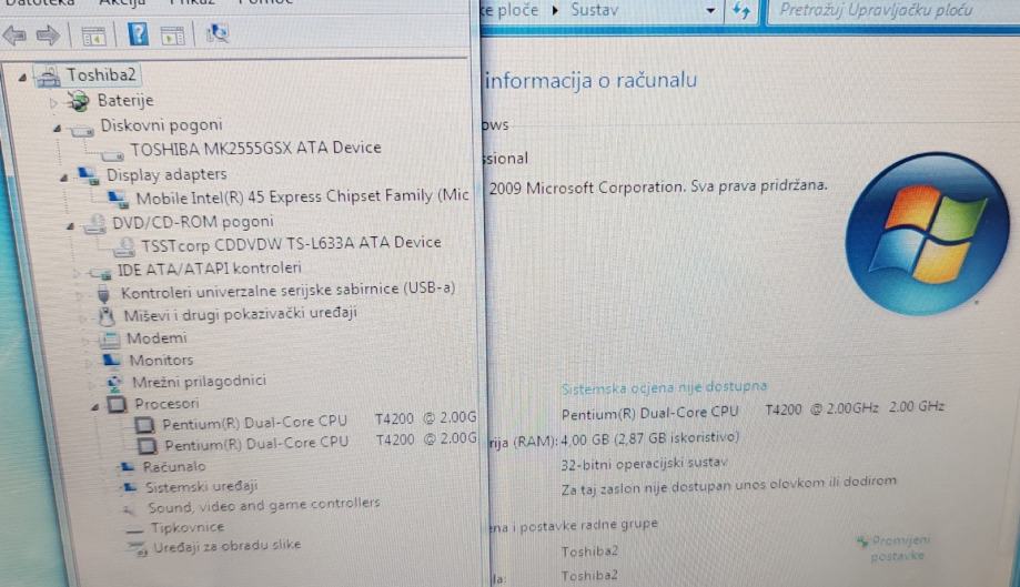 toshiba L300 laptop Pentium T4200 4gb ram 250gb hdd
