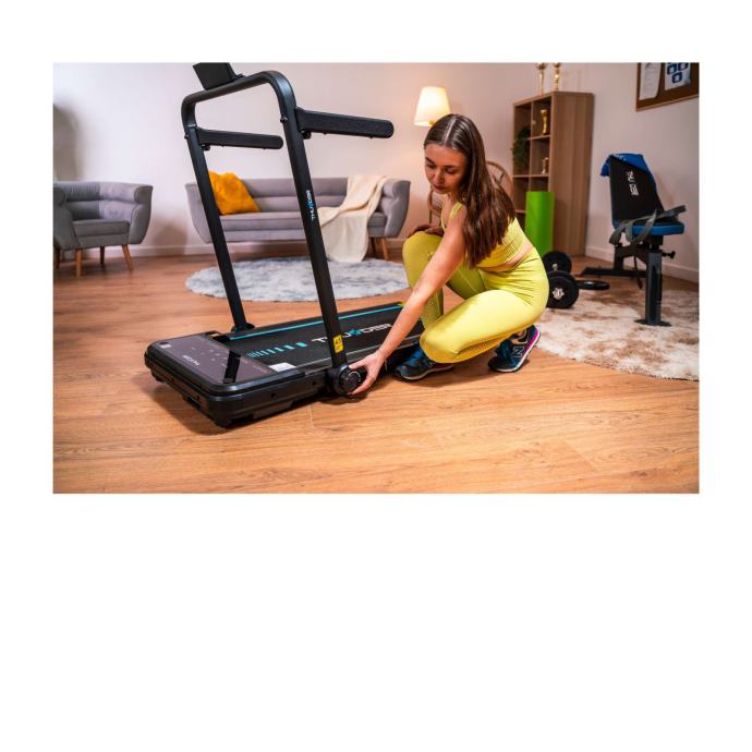 Površina za trčanje od 40 × 106,5 cm i stabilizacijska stopala osiguravaju udobnost i sigurnost pri svakom koraku, dok je maksimalna nosivost čak 130 kg. Uređaj teži svega 33 kg, a zahvaljujući kotačićima za transport možeš ga jednostavno premjestiti ili pospremiti.
