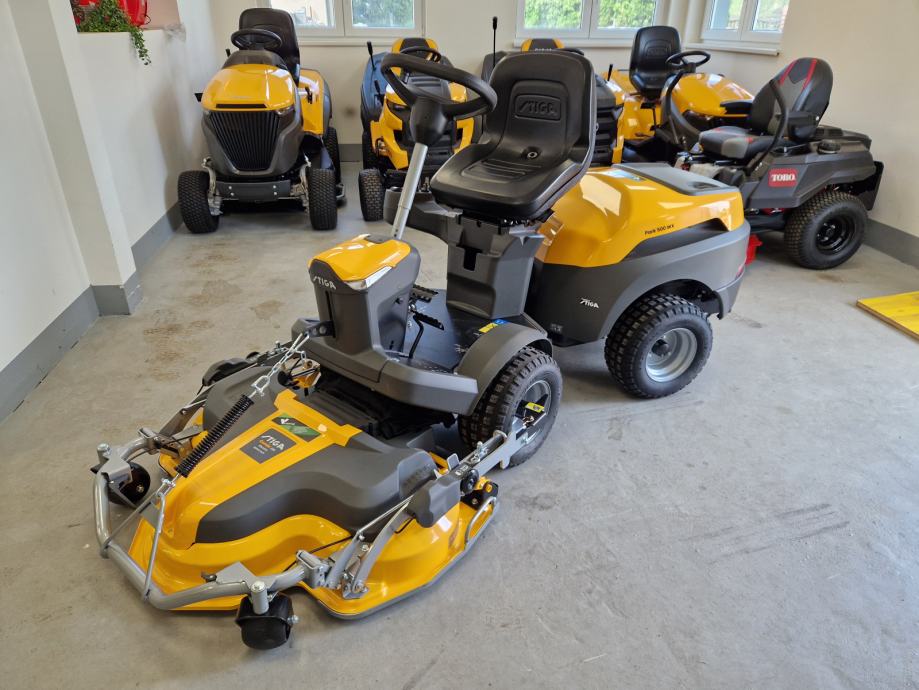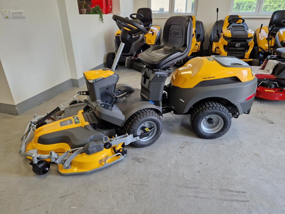 Prodaje se traktor kosilica Stiga Rider Park Pro 500 WX 4WD: 18 KS, 2 Stiga motor, pogon na sva 4 kotača, kosište s 3 noža, širina otkosa 100 cm, hidrauličko dizanje i spuštanje kosišta servo volan.