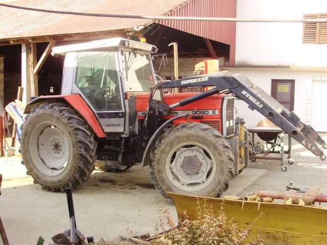 MASSEY FERGUSON, 3080 E,100 KS,6 cilindara, 1992 god.,9300radnih sati,registriran do 12.2016.,40 km/h,zračno sjedalo gramer, gume prednje 420/80/28 skoro nove,zadnje 18.4R38, 70%, utezi 9 komada po cca 40 kg, automatska kuka, utovarivač STOLL sa dva cilindra