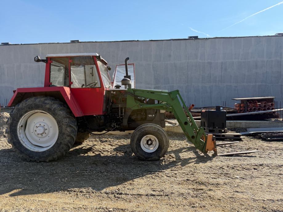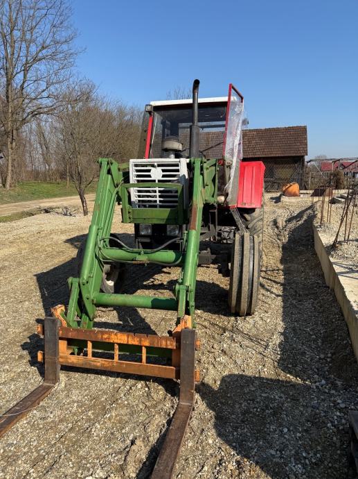 Na traktoru je montiran prednji utovarivač, spreman za rad (zemlja, drva, gnojivo itd.).