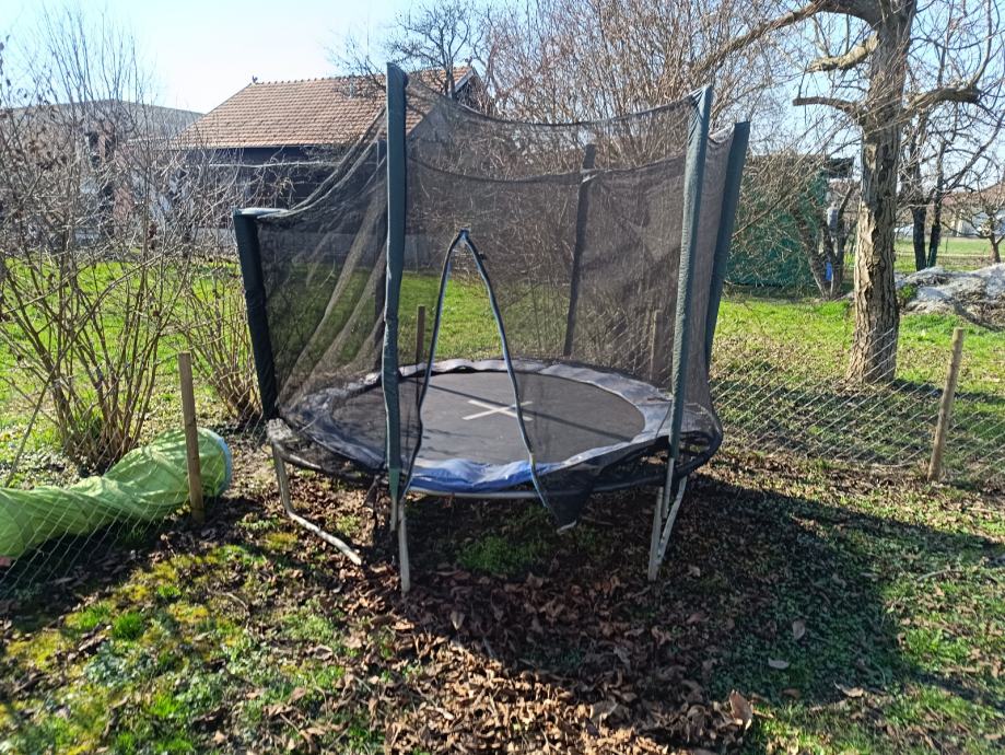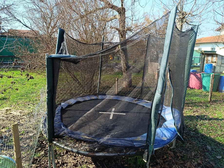 Poklanjam dječji trampolin s zaštitnom mrežom oko skakačke površine. Radi se o okruglom trampolinu tamne boje, srednje veličine, s metalnim nogama i stupovima koji nose zaštitnu mrežu. Promjer oko 2 metra.