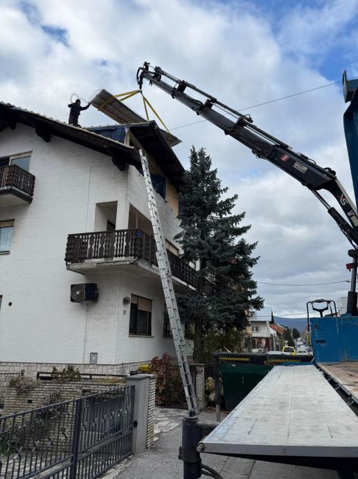 Solarni paneli i oprema učvršćuju se profesionalnim trakama i podižu kontrolirano, bez naglih pokreta. Operater krana stalno prati položaj tereta kako bi se osiguralo ravnomjerno spuštanje na krov ili drugu površinu. Tijekom rada vodi se računa o zaštiti krovišta, fasade, oluka i okolnih objekata.