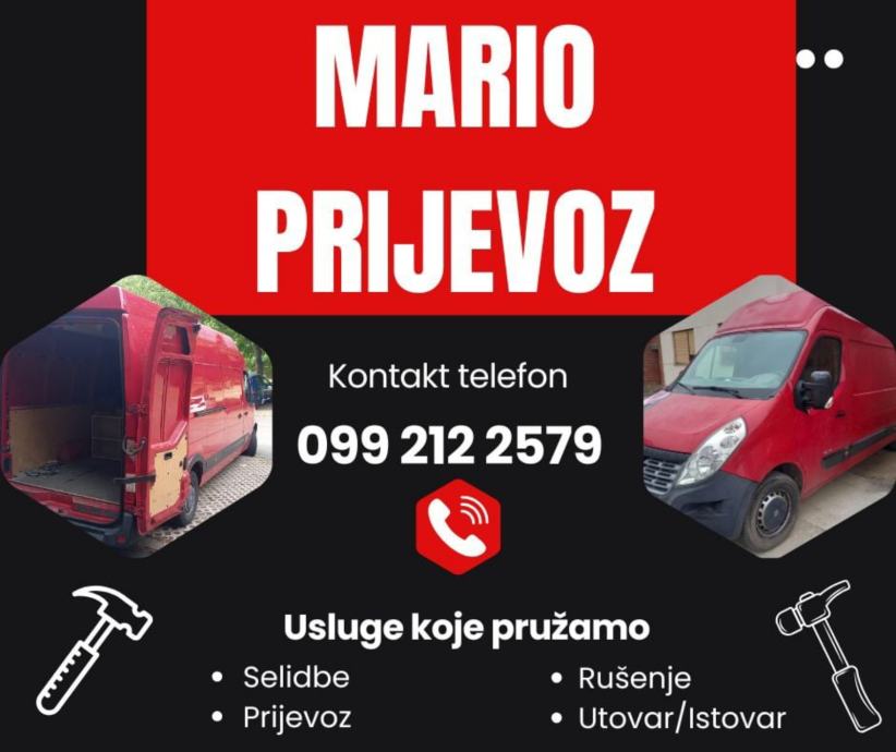 Obavljamo povoljno, stručno i kvalitetno usluge prijevoza, selidbe, odvoz starog namještaja i tehnike, odvoz šute do 1,5t demontaža parketa pločica,razbijanje kupatila,rušenje zidova i manjih objekata(šupa,garaža)rušenje i rezanje stabala,grana i voćaka,kopanje panjeva,krčenje grmlja,bušenje rupa za ograde i vočke.Košnja trave i održavanje travnjaka.Također vršimo i usluge čiščenja tavana, stanova, kuća, garaža, podruma,dvorišta.