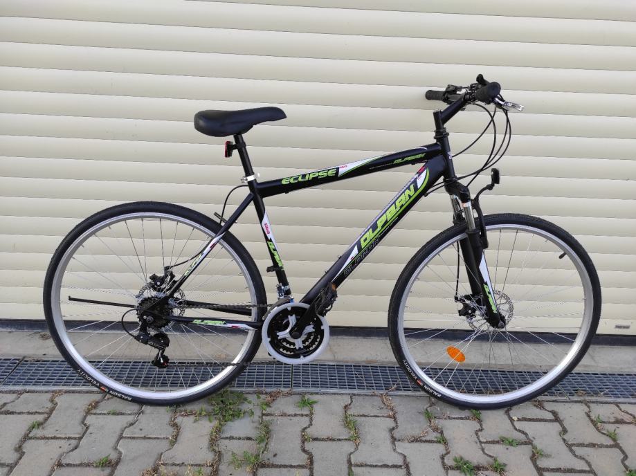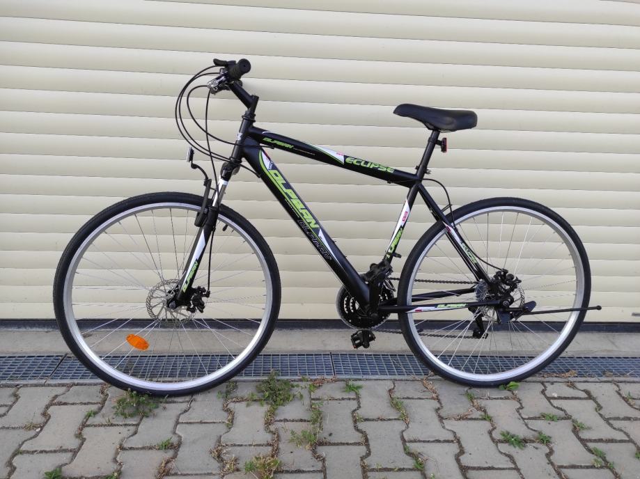Potpuno novi muški bicikl Olpran Elipse s ramom veličine M (43-47cm). Idealan je za trekking i touring vožnje, opremljen disk kočnicama i višebrzinskim mjenjačem. Crno-zeleni dizajn s udobnim sjedalom i kvalitetnim gumama savršen je za svakodnevne vožnje i duže izlete.
