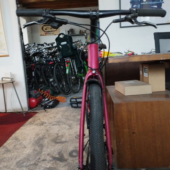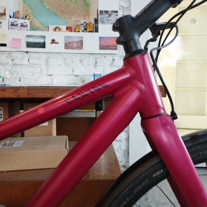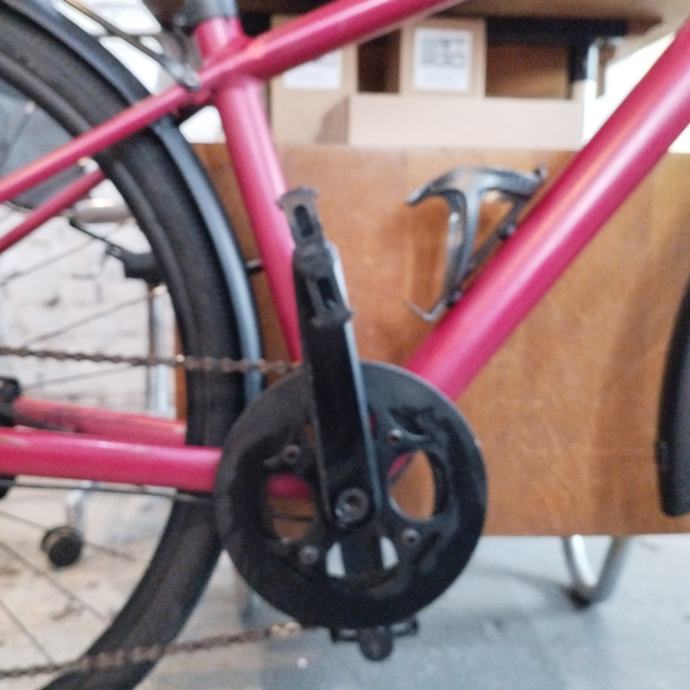 A 650b aluminum frame commuter bike with upper mid-range components and shimano hydraulic disc brakes.