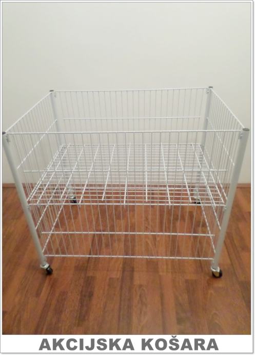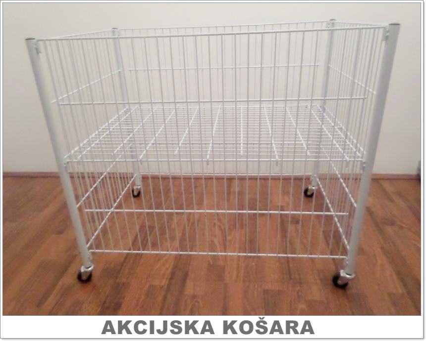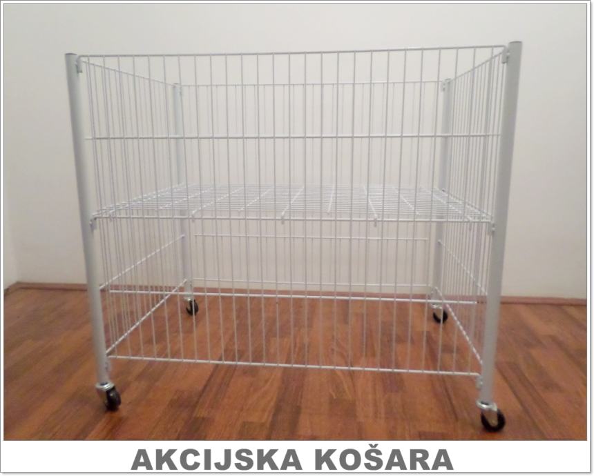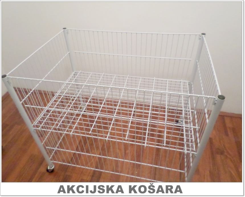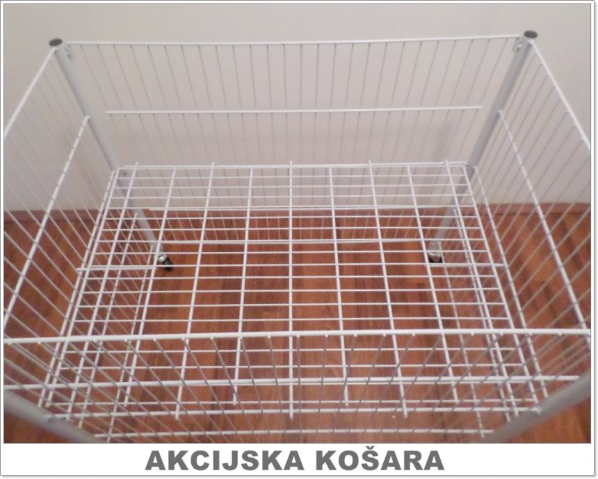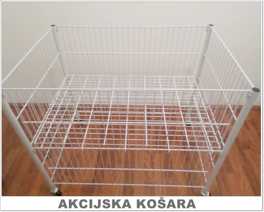 Prodajemo metalne košare za izlaganje razne robe. Košara ima 4 razine tako da robu možete staviti na različite visine. Dužine 90 cm, širina 60 cm, visina 80 cm. Novo, plastificirano