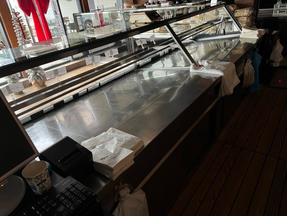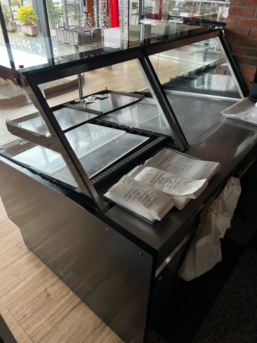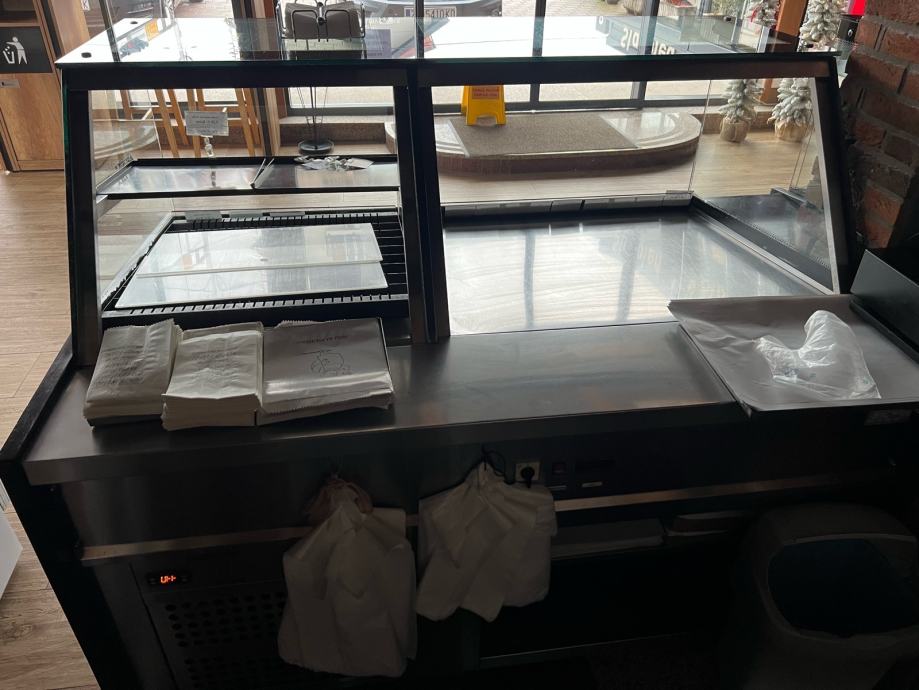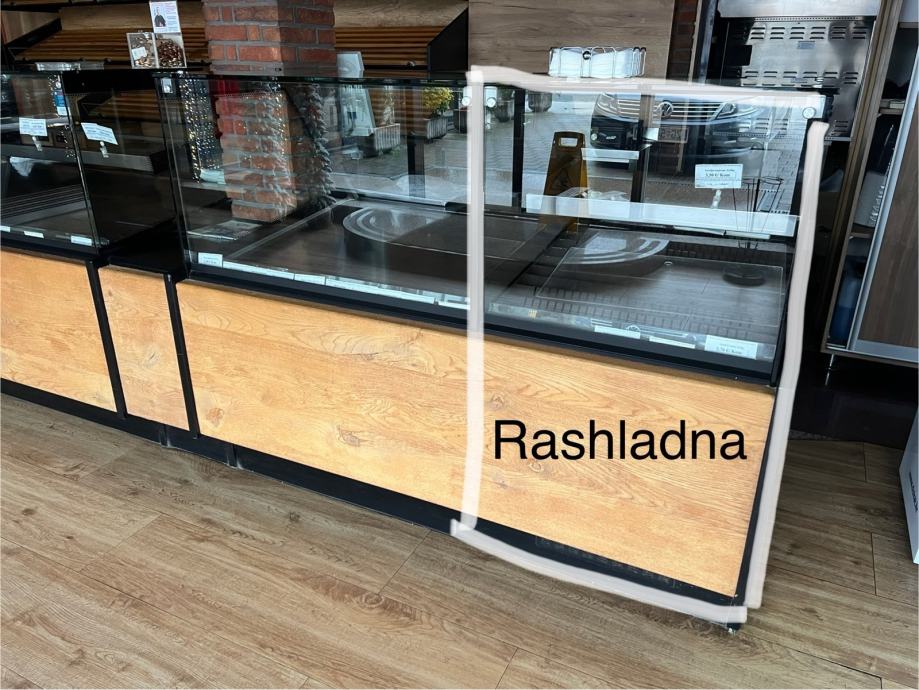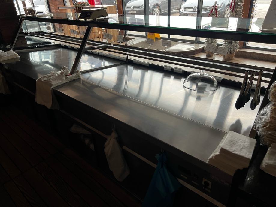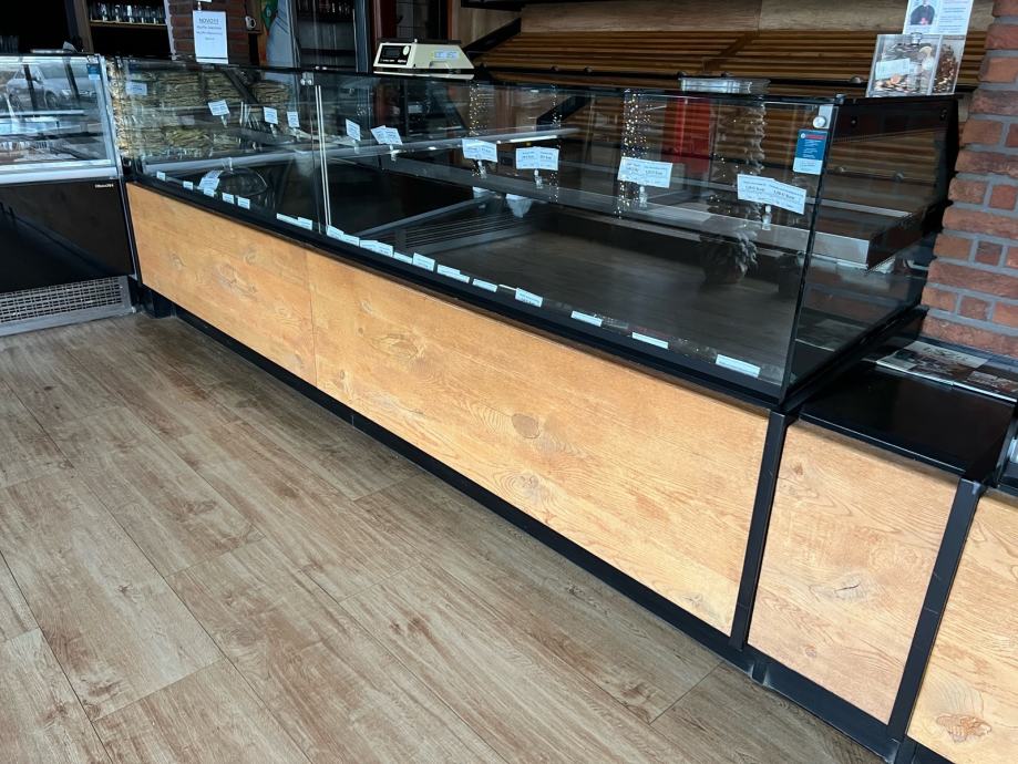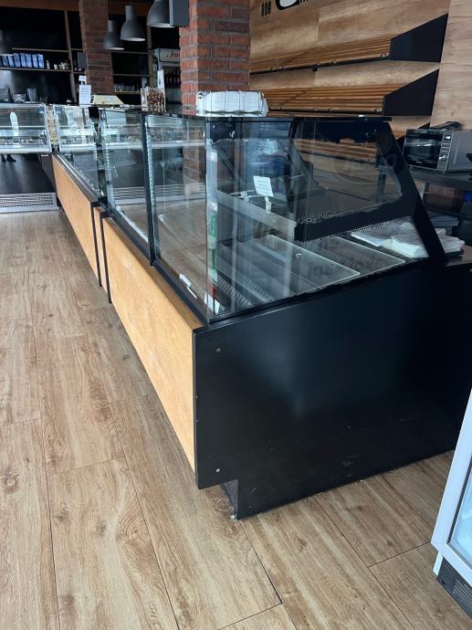 Prodajem rabljene pekarske vitrine, koje su u vrhunskom stanju. Sirina vitrina je 120cm, a visina 130cm. Obloga vitrine je od pravog hrasta!! Izlozbeni prostor u vitrinama je 80cm plus 30cm radnog prostora za drzanje skarnicli i hvataljki. Ispod vitrina je skladisni prostor. Velika vitrina je komplet grijana te je dugacka 2x175cm, dok je manja 165cm od cega je rashladni dio vitrine za sendvice i tortilje 65cm. Velika vitrina ima dodatnu policu.