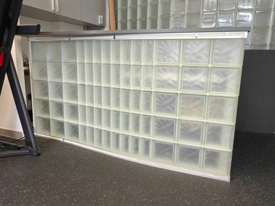 Vrhunska staklena opeka njemačke proizvodnje, vanjska strana je matirana. Vertikalni brid na uglu formiran je od tvornički izrađenih ugaonih staklenih opeka s urednim ravnim bridom, što je omogućilo kontinuitet staklene plohe. Aluminijski okvir profesionalno i precizno krojen, savijen i eloksiran prije sastavljanja. Gornja ploha od masivnog MDFa, rezanog na mjeru i kantiranog.