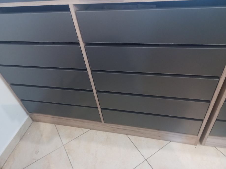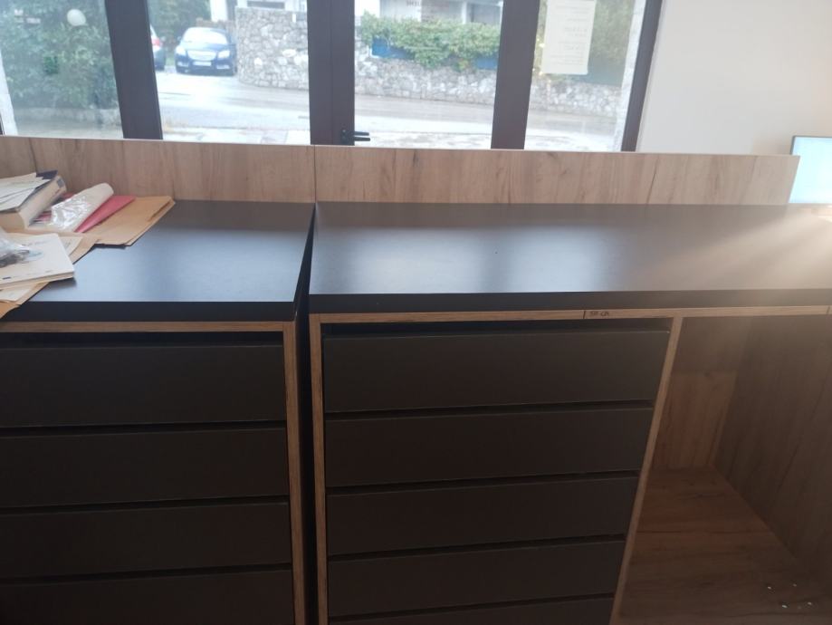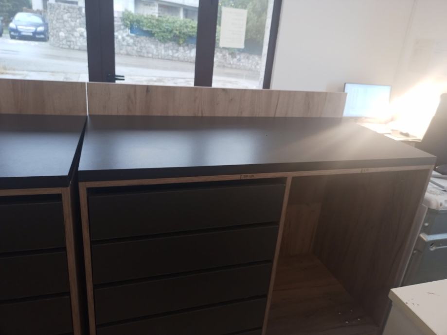Prodajni pult sa ladicama, pogodno za trgovinu ili skladište, kombinacija antracit i boja hrasta dva komada koji se spoje i na kotačima su.