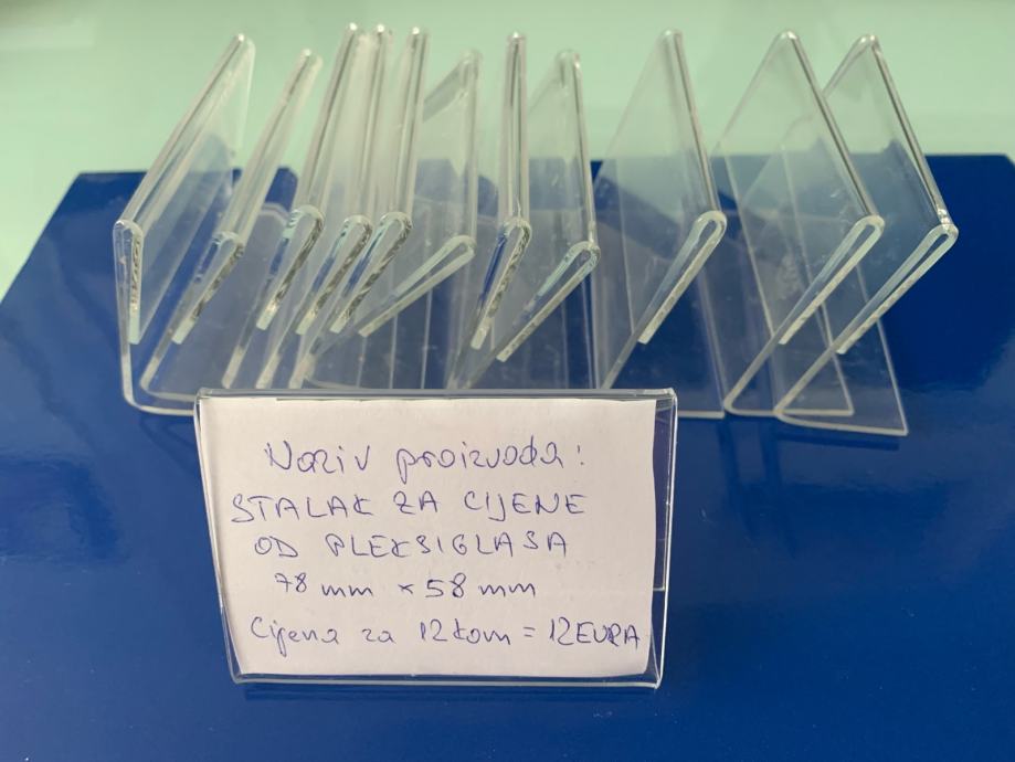 Prodajem 12 kom stalaka za cijene od pleksiglasa 78x58 mm za 12 eura, kao novo, neoštećeno.