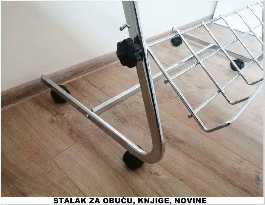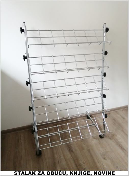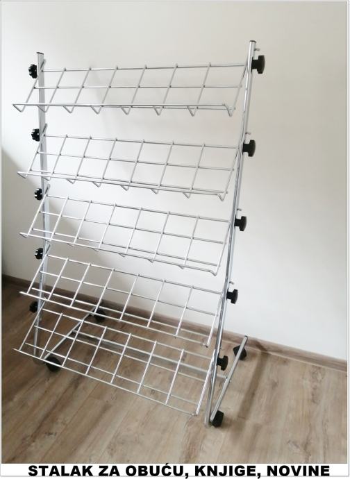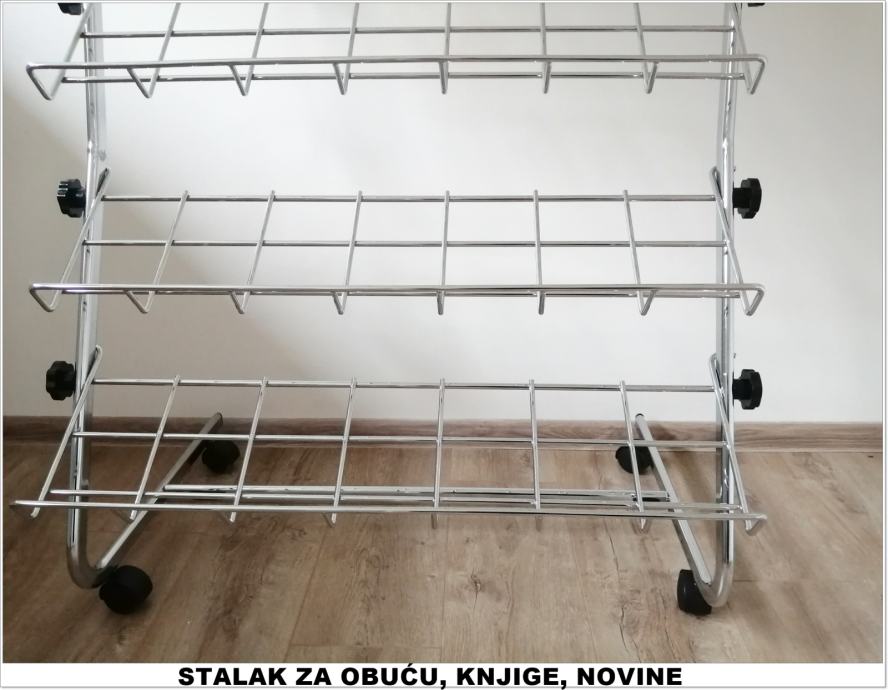 Prodajemo profesionalne stalke za cipele i ostalu obuću, knjige, DVD-e... Namjenjeni su za butike i poslovne prostore, a može biti i za kućnu upotrebu. Stalci su čvrsti i podnose velike težine. Novo, kromirano.