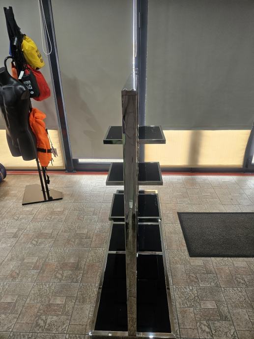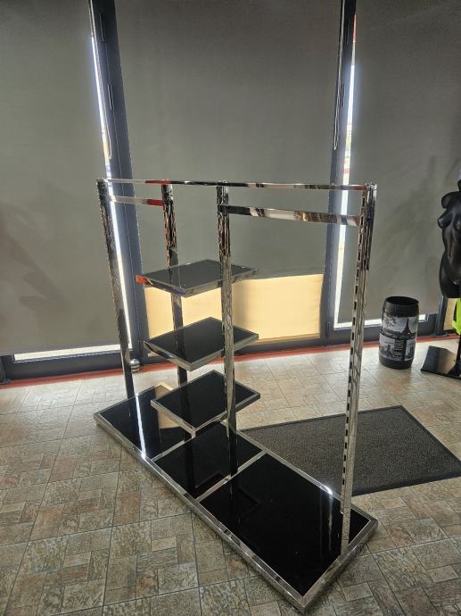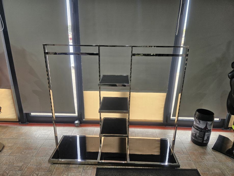 Prodajem stalak za izlaganje odjeće i obuće s kromiranim metalnim okvirom i crnim policama od sjajnog materijala. Stalak ima dvije horizontalne šipke za vješanje odjeće postavljene s obje strane, dok se u središnjem dijelu nalaze tri police različitih veličina pogodne za izlaganje obuće ili složene odjeće. Baza stalka je široka i stabilna, također u crnoj sjajnoj izvedbi, što osigurava dobru stabilnost. Kombinirani dizajn šipki za vješanje i polica čini ga funkcionalnim rješenjem za izlaganje više vrsta artikala istovremeno. Na stanju 2 komada. 100€ po komadu.