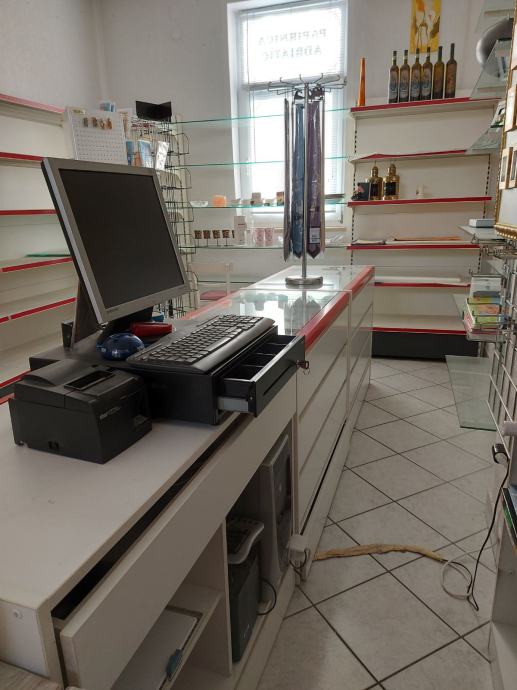 Komplet nventara za prodajni prostor uključuje 10m polica u vrlo dobro očuvanom stanju, bez oštećenja. Materijal metal u bijeloj boji i staklo. Inventar je dio poklon galerije i papirnice koja je zatvorena. Uključuje 7kom metalnih podnih polica bijele boje s metalnom poleđinom (ukupno 7.7m dužnih, visine 1.9m) Razmaci između polica su podesivi po visini. Uključene su i dvije police s metalnim nosačima i staklenim policama ukupne dužine 2.55m i visine 1.9m, također razmaci podesivi po visini.