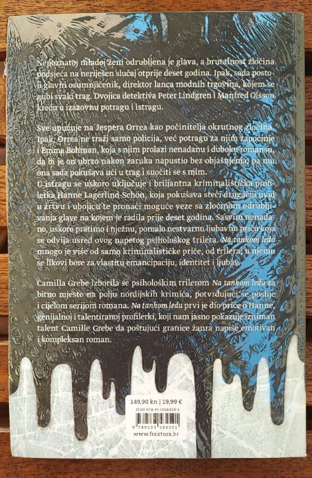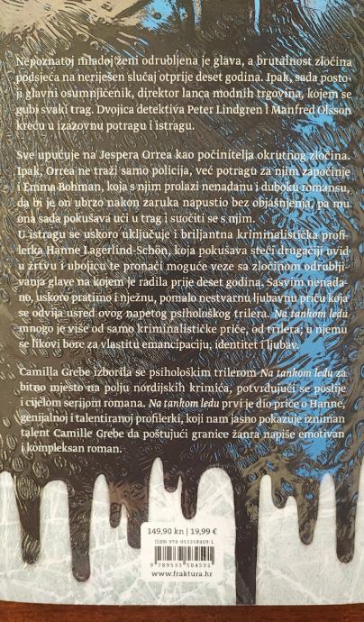 Camilla Grebe izborila se psihološkim trilerom Na tankom ledu za bitno mjesto na polju nordijskih krimića, potvrđujući se poslije i cijelom serijom romana. Na tankom ledu prvi je dio priče o Hanne, genijalnoj i talentiranoj profilerki, koji nam jasno pokazuje izniman talent Camille Grebe da poštujući granice žanra napiše emotivan i kompleksan roman.