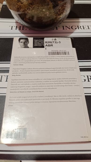 "Ljubavnik poznat po vječnoj potrazi za ljubavlju genijalno je oživljen u ovom napetom debitantskom romanu Douglasa Carltona Abramsa. Uokvirena u dnevnik don Juana, čuvan od davnina, priča od početka teče nepopustljivim galopom. Nit pripovijesti odmata se slijedeći uzbudljivu putanju trilera i emotivnu privlačnost povijesnog romana."