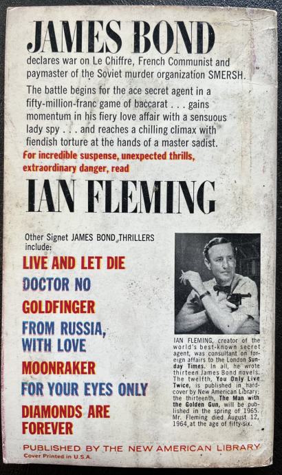 Prodajem roman Iana Fleminga: Casino Royale (prvi iz serije romana o Jamesu Bondu koji je autor napisao 1953. godine) na engleskom jeziku, paperback, u mekom uvezu i u izvrsno očuvanom stanju.