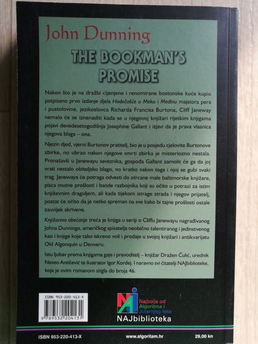 Prodajem knjigu "Knjižarevo obećanje " autora Johna Dunninga u izdanju "Algoritma", meki uvez. Knjiga je nova (inače treći dio serije romana o detektivu i antikvaru Cliffu Janewayu (pentalogija: Knjižareva smrt, Knjižarev trag, Knjižarevo obećanje, Umorstvo s potpisom, te zadnja neprevedena Kolekcionarka knjiga)).