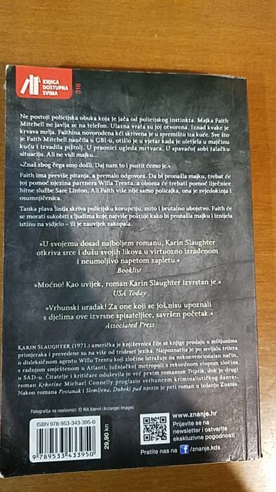 Karin Slaughter (1971.) jedna je od najpoznatijih američkih autorica trilera danas. Njezini romani prodani su u više od 35 milijuna primjeraka i prevedeni u 37 zemalja. Poznata je po svojim serijalima o agentu Willu Trentu i doktorici Sari Linton, a za njezine samostalne romane Grad murjaka, Dobra kći i Pieces of Her već su otkupljena prava za snimanje televizijskih serija i filmova.