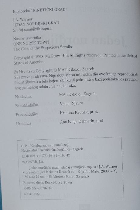 Knjiga Jedan Nordijski grad (Slučaj sumnjivih zapisa), J.A.Warner, prodajem za 10,00 € !!