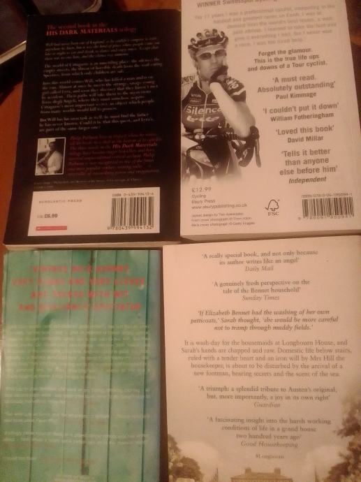 Jo Baker - Longbourn ( Ponos I predrasude iz perspektive posluge); Charly Wegelius - Domestique, Philip Pullman - The Subtle Knife ( drugi dio trilogije "Njegovi tamni materijali") i Nick Hornby - How to be good. Pojedinačno za 2€ komad ili sve 4 za 6€.