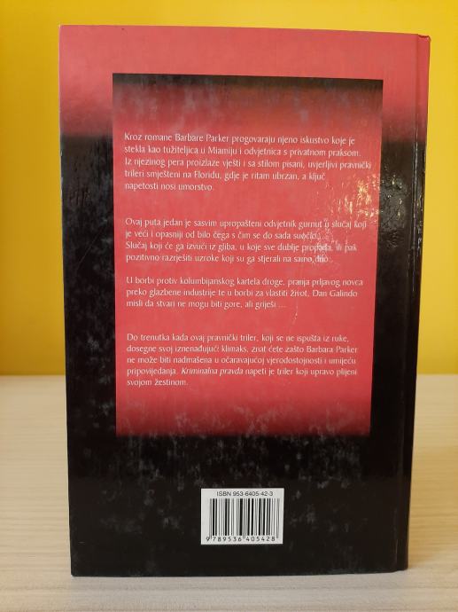 Kroz romane Barbare Parker progovaraju njeno iskustvo koje je stekla kao tužiteljica u Miamiju i odvjetnica s privatnom praksom. Iz njezinog pera proizlaze vješti i sa stilom pisani, uvjerljivi pravnički trileri smješteni na Floridu, gdje je ritam ubrzan, a ključ napetosti nosi umorstvo.Ovaj puta jedan je sasvim upropašteni odvjetnik gurnut u slučaj koji je veći i opasniji od bilo čega s čim se do sada suočio ... Slučaj koji će ga izvući iz gliba, u koje sve dublje propada, ili pak pozitivno razrješiti uzroke koji su ga stjerali na samo dno.U borbi protiv kolumbijanskog kartela droge, pranja prljavog novca preko glazbene industrije te u borbi za vlastiti život, Dan Galindo misli da stvari ne mogu biti gore, ali griješi ...Do trenutka kada ovaj pravnički triler, koji se ne ispušta iz ruke, dosegne svoj iznenadujući klimaks, znat ćete zašto Barbara Parker ne može biti nadmašena u očaravajućoj vjerodostojnosti i umijeću pripovijedanja. Kriminalna pravda napeti je triler koji upravo plijeni svojom žestinom.