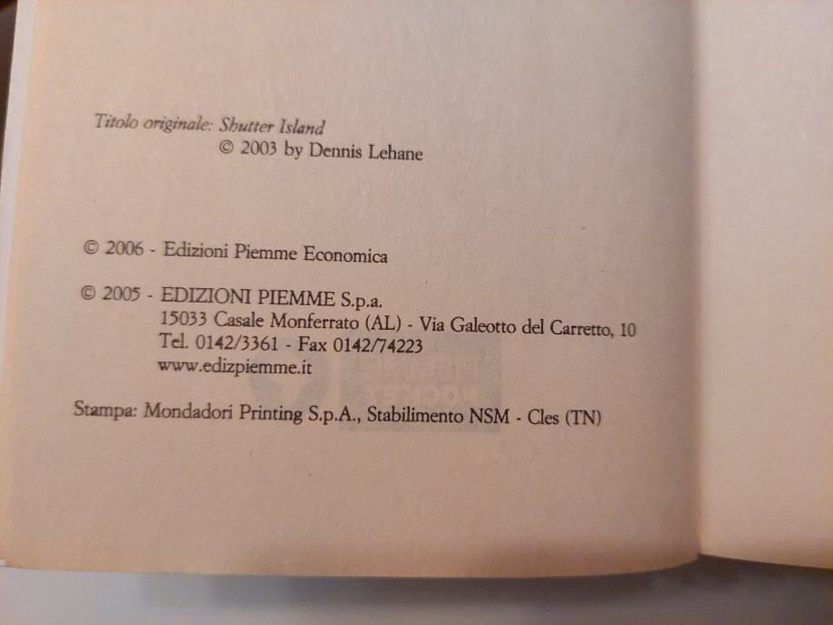 Knjiga "L'isola della paura" ("Shutter island" na talijanskom jeziku)
