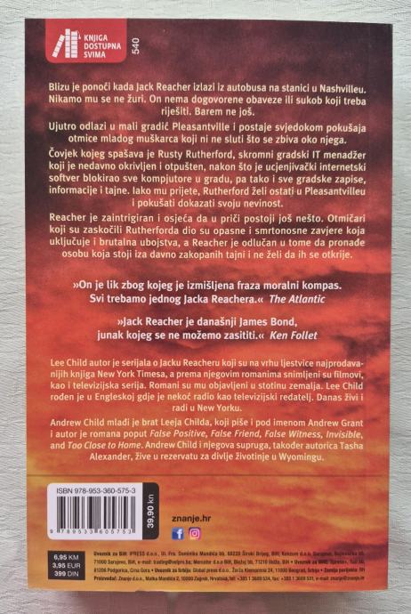 Jack Reacher, čovjek bez mobitela i adrese, uz nevjerojatnu hrabrost, snagu i fizičku kondiciju, posjeduje i beskompromisnu odlučnost da se pod svaku cijenu obračuna s nepoštenjem i kriminalom. U njegovu je liku utjelovljen lik suvremenog superheroja, a knjige o Jacku Reacheru spadaju u rijetke akcijske romane koje s podjednakim oduševljenjem čitaju i žene i muškarci.