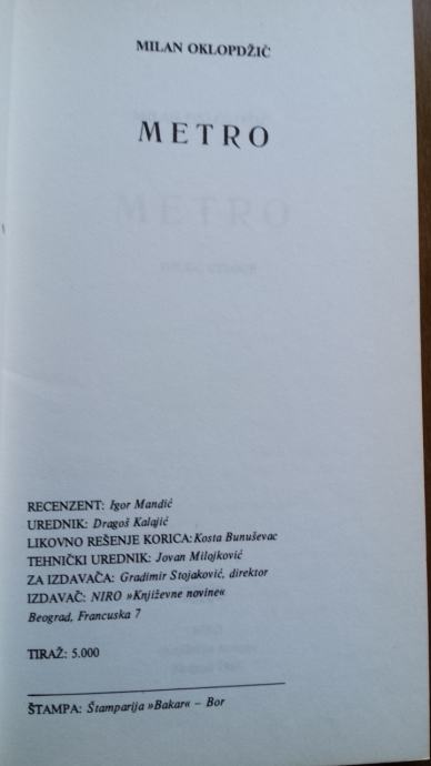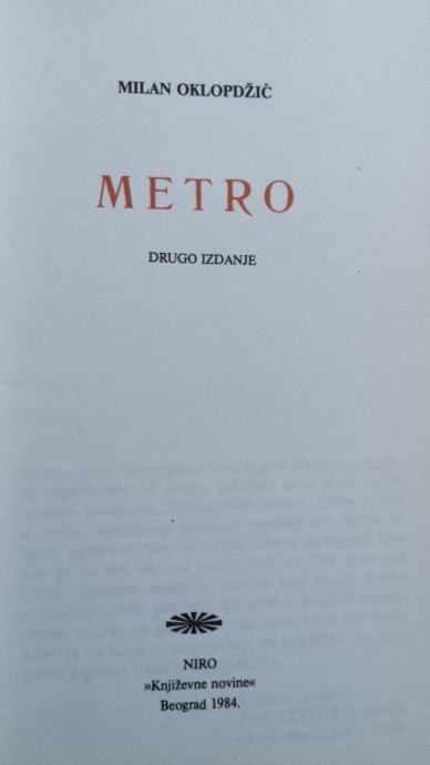 Roman „Metro” Milana Oklopdžića u svoj tematski prioritet stavlja specifičan primer beogradskog marginalca, milje rok generacije, paradoks urbane i provincijalne prigušenosti. Obeležje konkretnog vremena u konkretnom individualnom predelu, imaginarnog i stvarnog iskustva, performansa sa ispovestima i samoironičnog otuđenja ovaj roman oslobađa opštih mesta, poznatih rešenja, efemerija vezanih za poreklo, običaje, stvarnost i onovremenske neuroze.