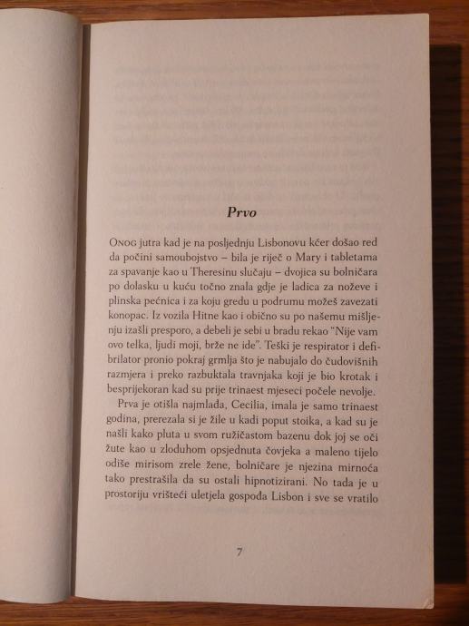 U ovom romanu-prvijencu prema kojem je Sofia Coppola snimila istoimeni film, pet zanosnih sestara tinejdžerki jedna se za drugom ubijaju u američkom predgrađu. Gorak i nježan, raskošan, liričan, zloslutan, crnohumorni roman koji hipnotizira ritmom i stilom te čitatelja nosi u mitsko carstvo kojem ne vladaju zdrav razum ili psihologija, nego kob. Likovi zagonetnih sestara i nakon dvadeset godina netaknuti žive u sjećanju momaka koji su ih obožavali, a sada se melankolično prisjećaju vlastitih tinejdžerskih dana. Adolescencija obasjana svjetlom magijskog realizma.