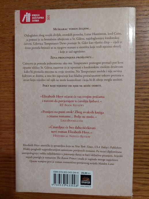 Dakle, ovo je prvi roman Elizabeth Hoyt iz njezinog serijala Maiden Lane i ujedno njezina prva knjiga kod nas prevedena. Knjiga me osvojila na prvu i progutala sam je u dva dana, te jedva čekam ostale naslove iz ovog serijala. Sadrži sve što može zadržati moju pozornost: romansu, misterij, ubojstvo. Radnja je dobra i brzo se razvija. Temperance je snažna i pametna žena, ali isto tako i ranjiva. Sviđa mi se kako je opisana njezina borba s vlastitom seksualnošću. Lord Caire je muškarac koji ne može podnijeti fizički dodir. Bio je zapostavljen kao dijete i ne zna što je ljubav. Strast koju osjećaju jedno prema drugome je ono što ih potiće da se emocionalno otvore jedno prema drugome.