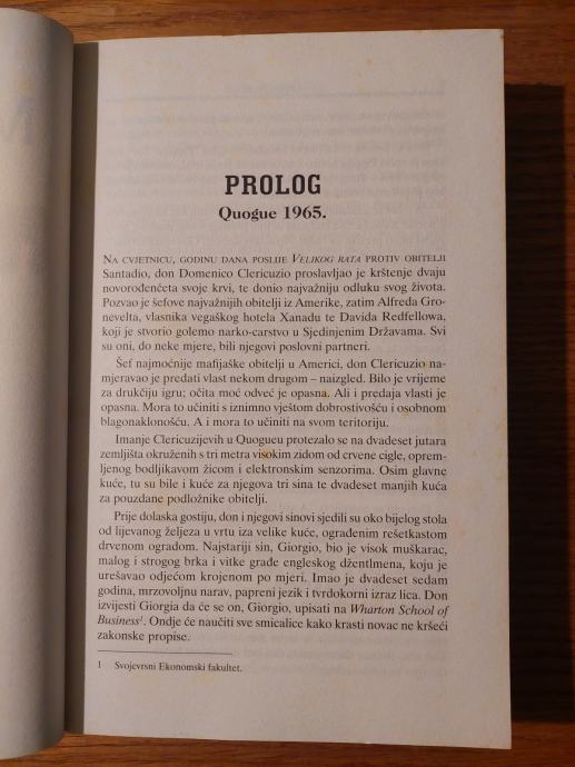 Domenico Clezienzio je posljednji šef velike mafijaške obitelji koji odlučuje predati posao svojim sinovima koji će voditi i potpuno legalan posao s uredno plaćenim porezima. Ali stare navike teško nestaju i rješavanje problema nasiljem se prenosi i na novu mafijašku generaciju... Najnoviji roman autora poznatog Kuma koji se u ovom romanu ponovno vratio temama koje najbolje poznaje: mafiji, kockanju i filmu.