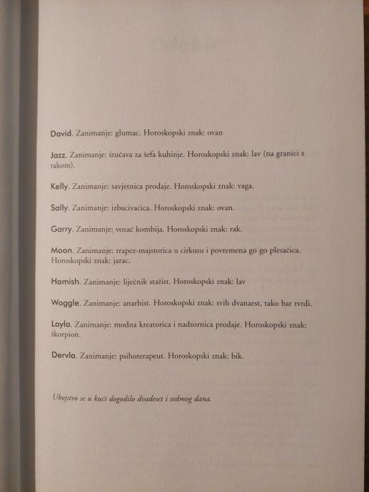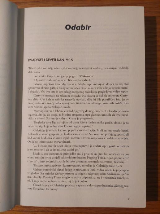 "Kako je moguće sakriti ubojstvo u potpuno zatvorenoj zajednici gdje je svaki milimetar prostora bio ili ozvučen ili pod budnim nadzorom kamere?" - pitao se inspektor Coleridge pregledavajući sate i sate video snimki popularne emisije "Kućni pritvor". Riječ je o zajednici osmero ljudi, čiji se životi svakodnevno snimaju i emitiraju višemilijunskom gledateljstvu u maniri glasovitog TV-showa "Big Brother". Ovim romanom autor problematizira odnos pojedinca i masovnih medija te, ispreplićući humoristične i kriminalističke elemente, parodira odnos javnog i privatnog, upirući prstom u nezaobilazan i zastrašujući derivat suvremena društva - apsolutnu izolaciju pojedinca od pojedinca te sveopću ravnodušnost i nezainteresiranost za druge.