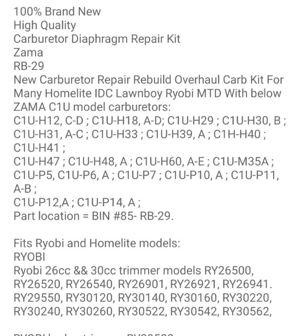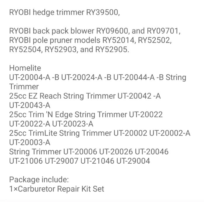 Set membrana (dijafragma) i brtvi za popravak karburatora, rasplinjača, koji odgovara za više vrsta Homelite i Ryobi te sličnih trimera, flakserica.