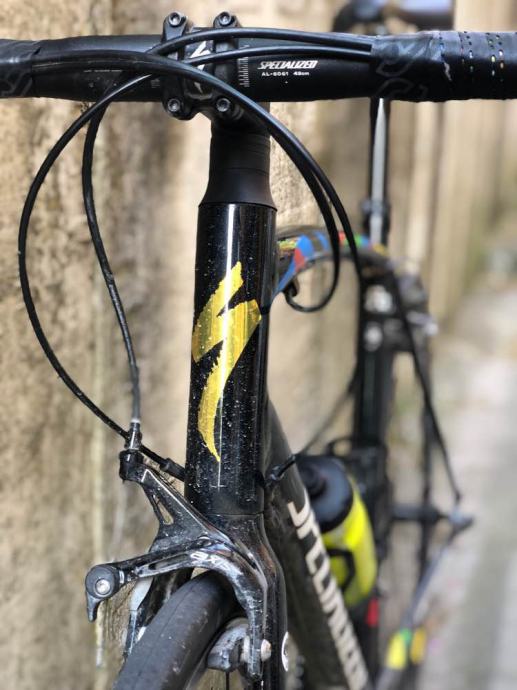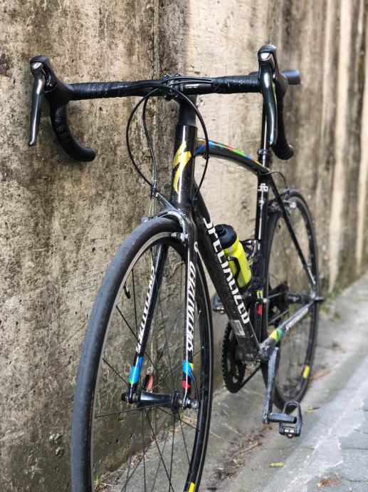 Prodaje se Specializedov castovnjak Allez elite E5 Peter Sagan. Bicikl je u odličnom stanju, nema niti jednu ogrebotinu. Čuvan, mažen i pažen. Poseban je radi toga jer je Sagan edicija pa je u njegovim bojama, a primarna je crna koja na suncu ima šareni odjsjaj. Veličina bicikla je 56. Mjenjač je Tiagra 2x11. Ima karbonsku vilicu, a sama rama je izrađena od premium aluminija. Na biciklu je sve u super stanju l jedino je promjenjen lanac i grip radi toga jer su se potrošili. Grip je marke Cinelli. Bicikl je kupljen u 8. mjesecu 2017 godine i do sad ima oko 4000km. Redovito je servisiran u Jaska bike shopu u Jastrebarskom gdje se to moze i potvrditi.