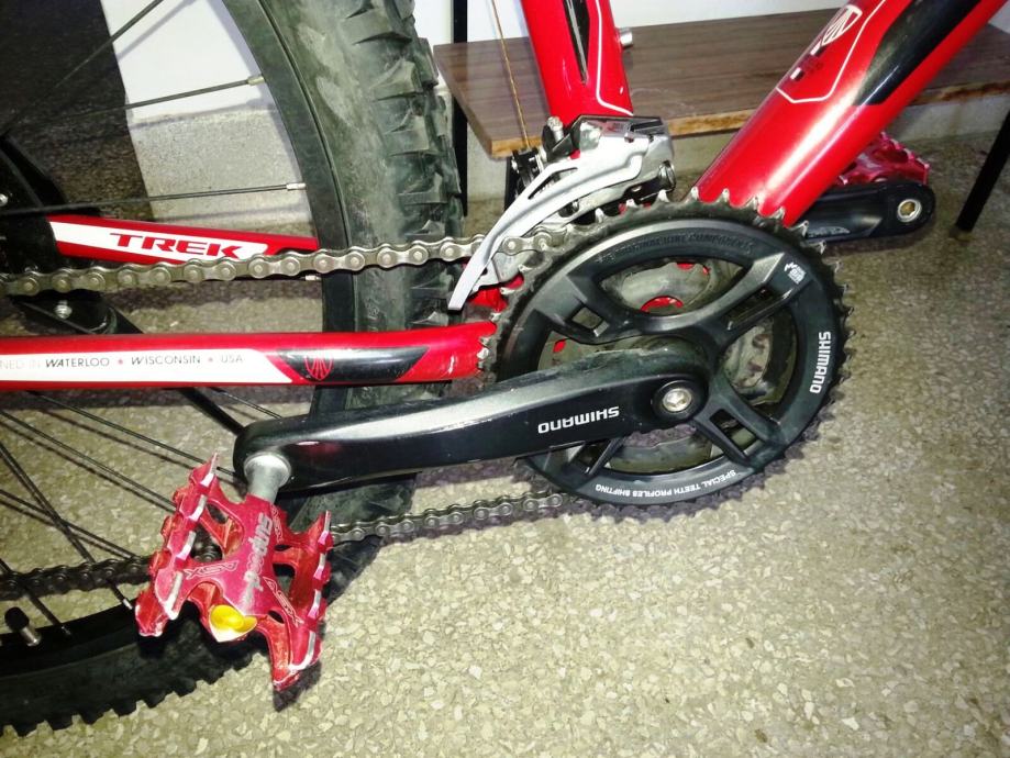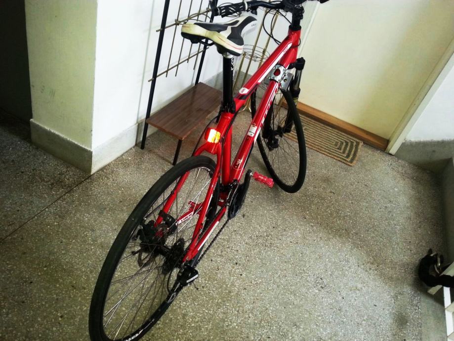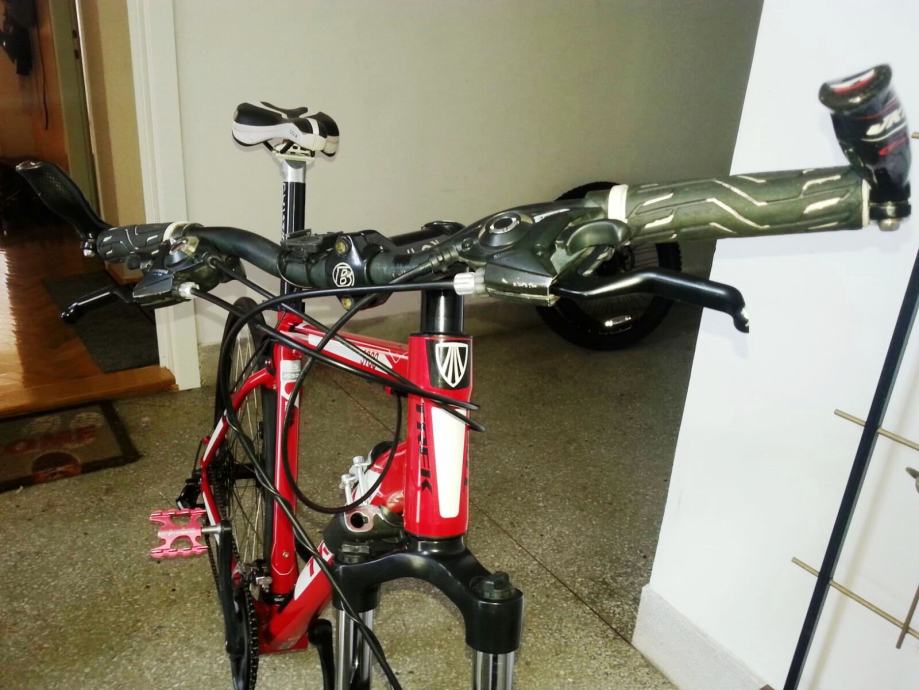 Stavljene atraktivne crvene alu pedale te karbonski rogovi za lakši položaj ruku.