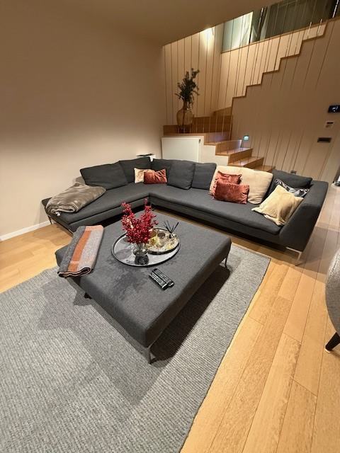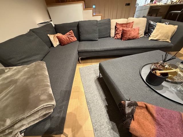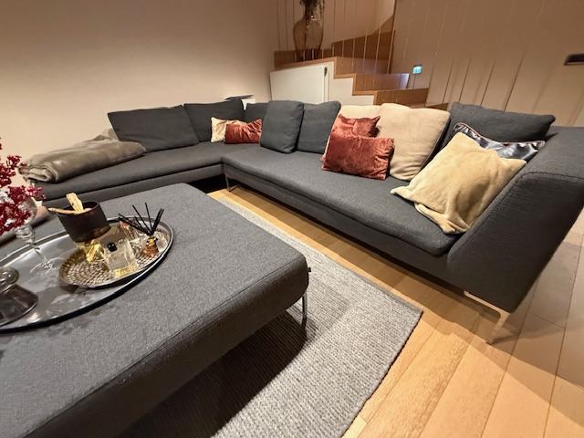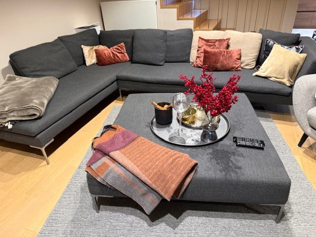 Prodajem lijepi tamnosivi kutni trosjed (kutna garnitura) marke B&B. Moderan dizajn, veliki kutni dio + taburet/ottoman koji se može pomicati.