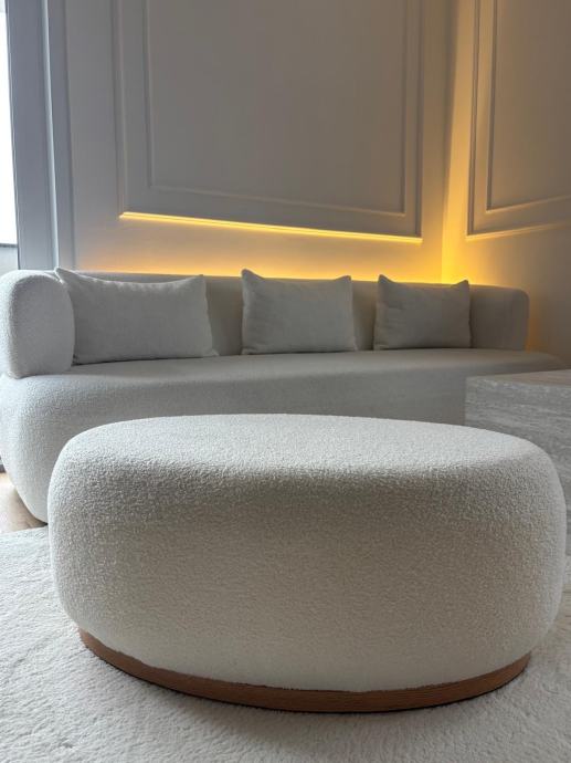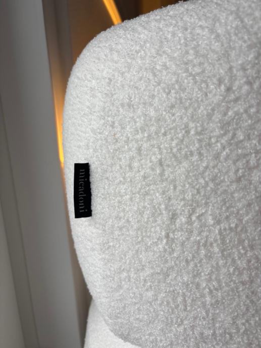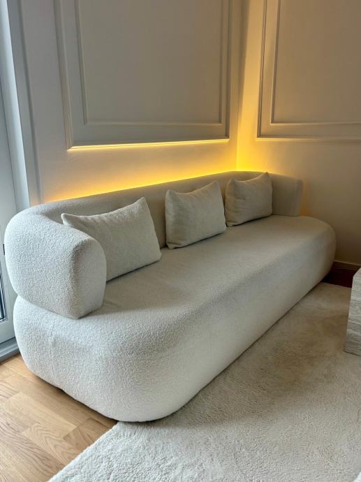 Prodajem trosjed bijele boje i pripadajuci tabure, oboje izradjeni od istog materijala - bijelog bouclea. Proizvodjac je Micadoni.