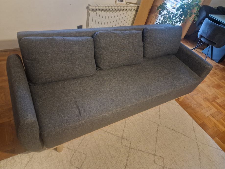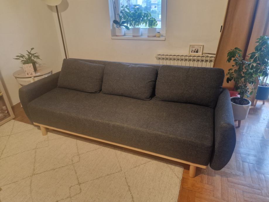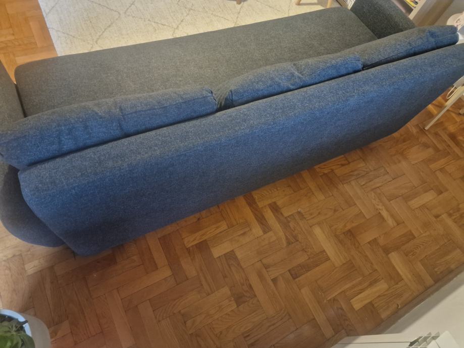 Trosjed je star par godina, kemijski očišćen. Tamno sive boje koja je jako zahvalna. Bez ikakvih oštečenja. Mijenjamo za veči. Dimenzije: 232cm x 89cm, ležaj 140cm x 200 cm.
