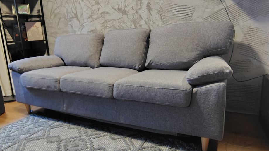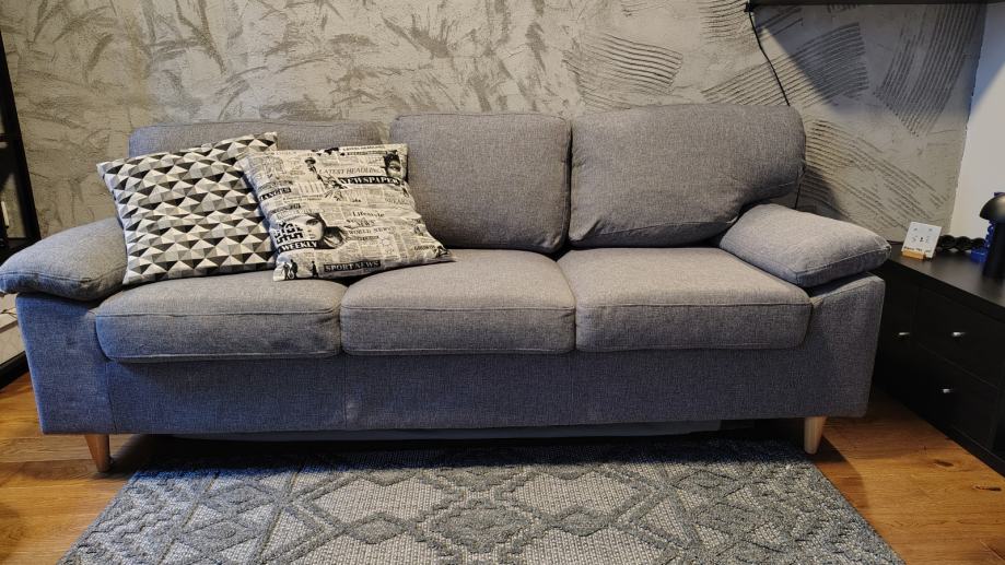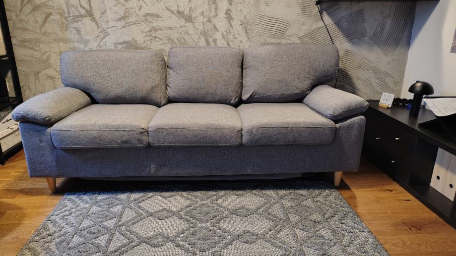 Kauč za 2,5 osobe uz malu naknadu. Dimenzije: širina cca. 185 cm, ukupna dubina 80 cm, dubina sjedala 50 cm i visina sjedala 47 cm. Patentni zatvarač na desnom naslonu je slomljen. Ako se skinu nasloni, kauč može funkcionirati kao kauč na razvlačenje.