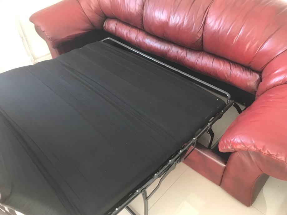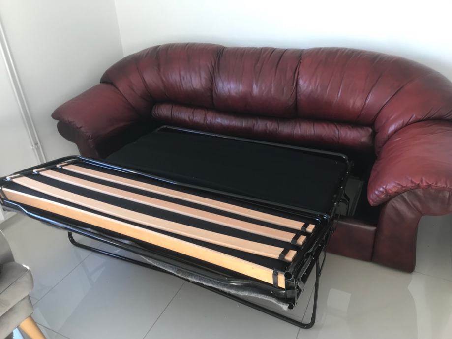 Trosjed od prave koze s mogučnosti razvlacenja kao krevet za dvije odrasle osobe.Trosjed je čvrst ,velikih dimenzija dužine od 240 cm.Na trosjedu potrebno na sjedalice stavit novu kožu ostalo u jako dobrom stanju.